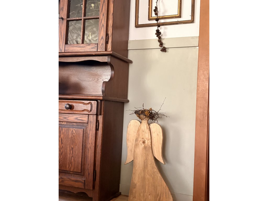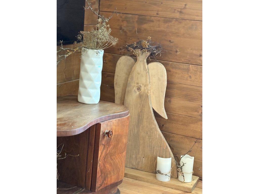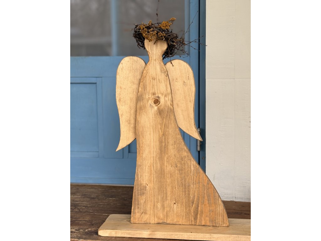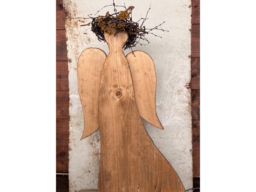 Drevený anjel s venčekom. Anjel má výšku 72,5 cm, šírku s podstavcom 57 cm. Odtieň orech. Farebne sa dá skombinovať podľa požiadaviek.