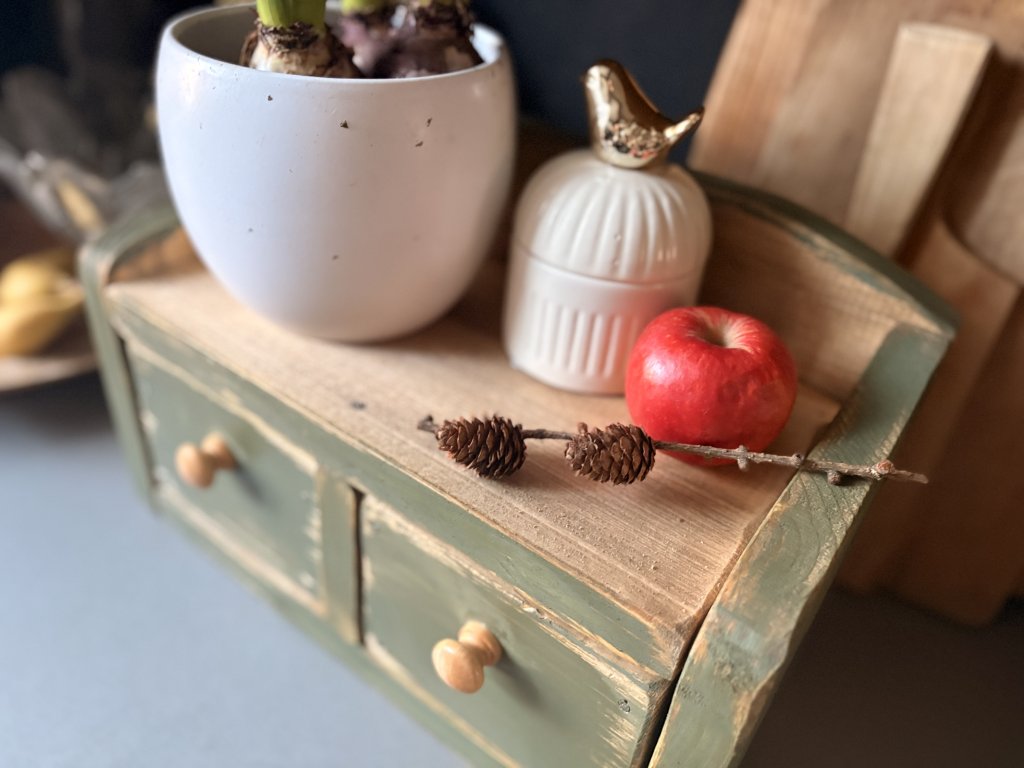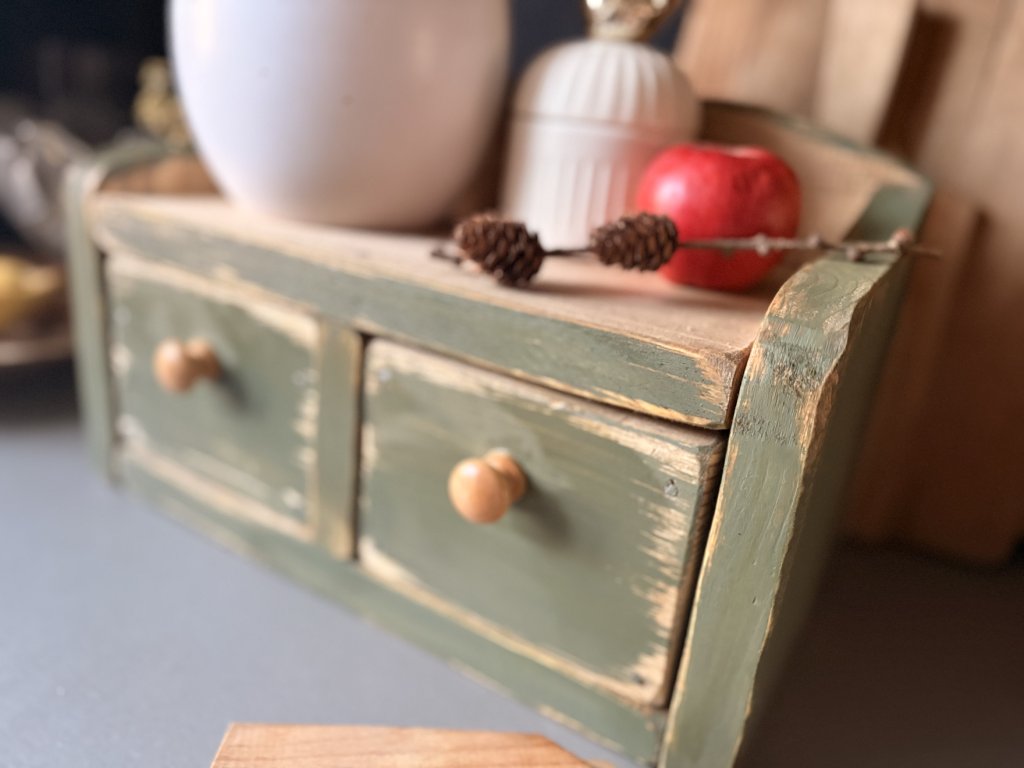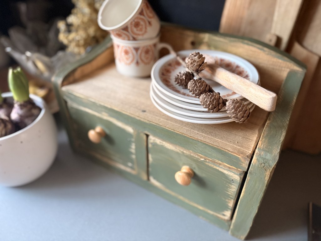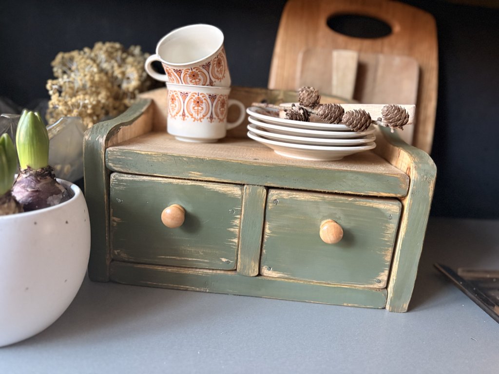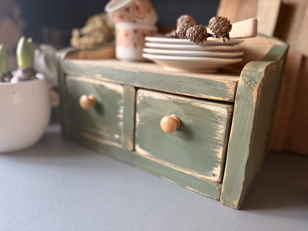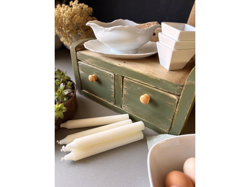 Drevená debnička kombinovaná s poličkou a dvomi šuplíkmi. Rozmery sú 39x19,5x22,5 cm (dxhxv). Farebnú kombináciu vám viem prispôsobiť.