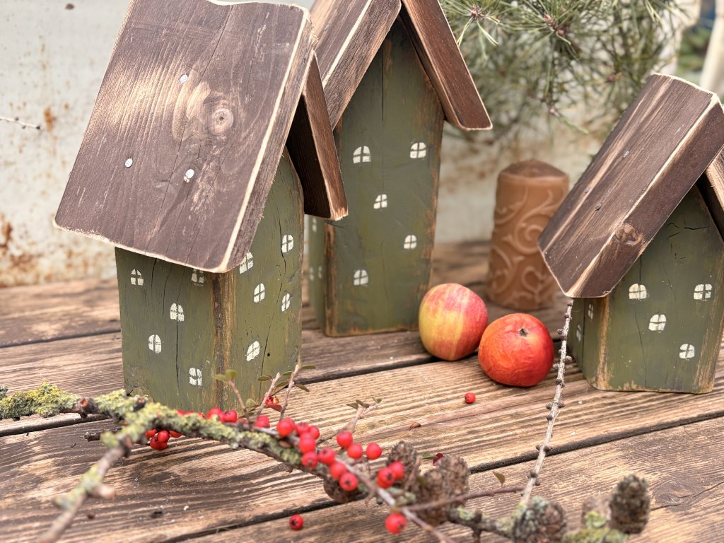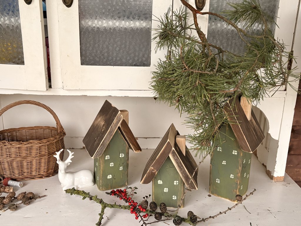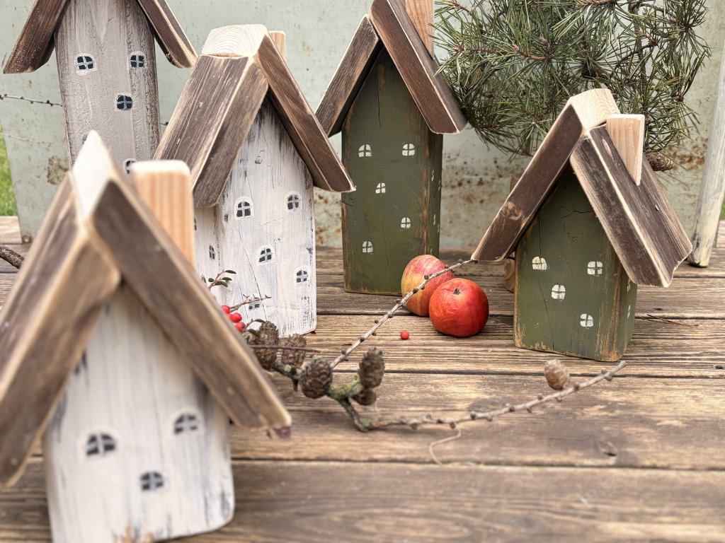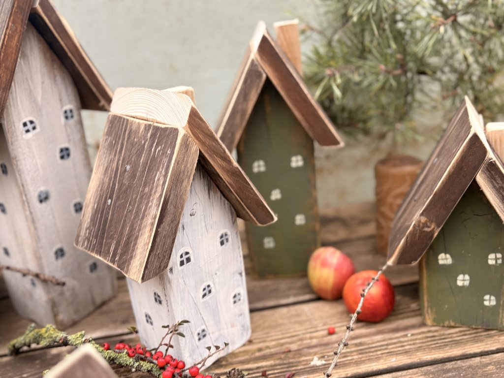 Drevené domčeky s vyškami 20 cm, 25 cm a 30 cm. Sú vyrobené z hranola 9x9 cm. Cena je za sadu troch kusov. Inú farbu ako bielu prosím uviesť do poznámky v objednávke.