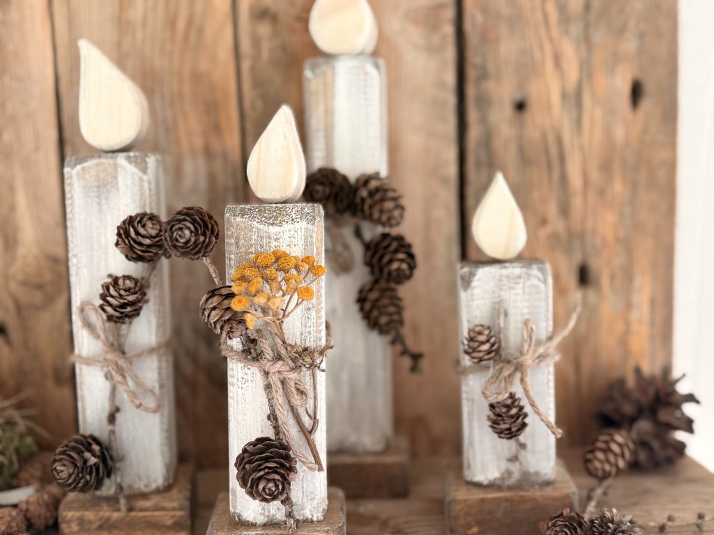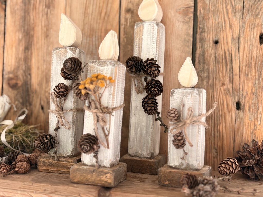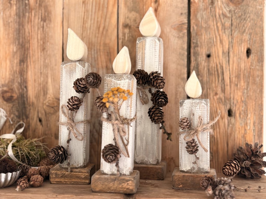 Drevené sviečky v odtieni orech a slonej kosti. Výšky sviečok sú 28 cm, 23 cm, 19,5 cm a 16,5 cm. Cena je za sadu štyroch sviečok.