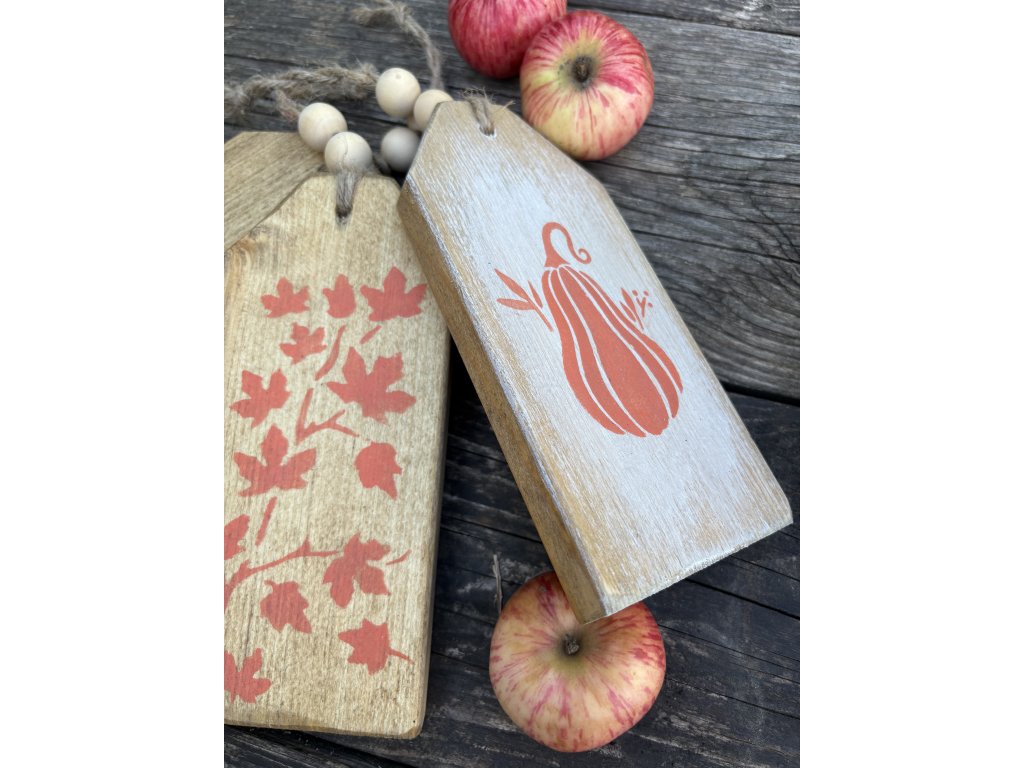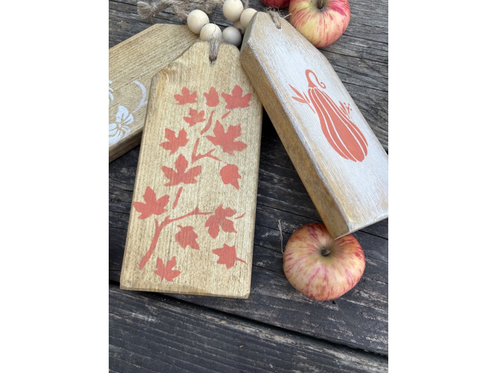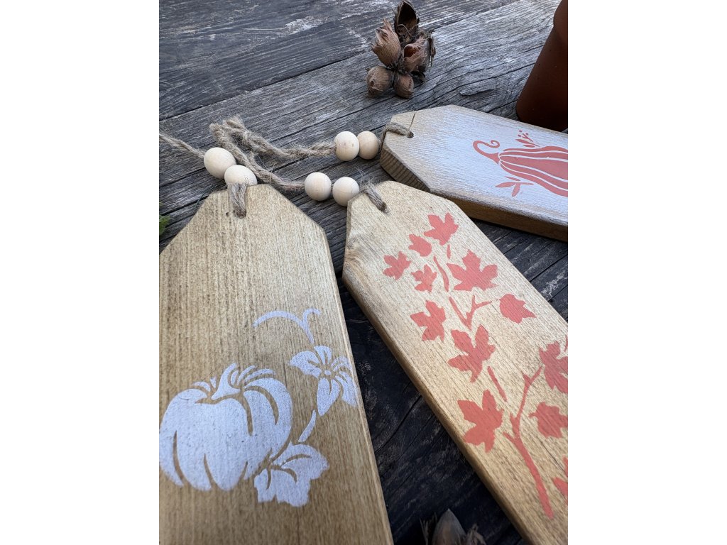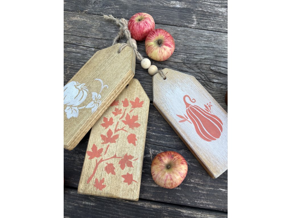 Sada troch jesenných etikiet s drevenými korálkami. Etikety majú rozmery 8x18 cm a hrúbku 1,8 cm.