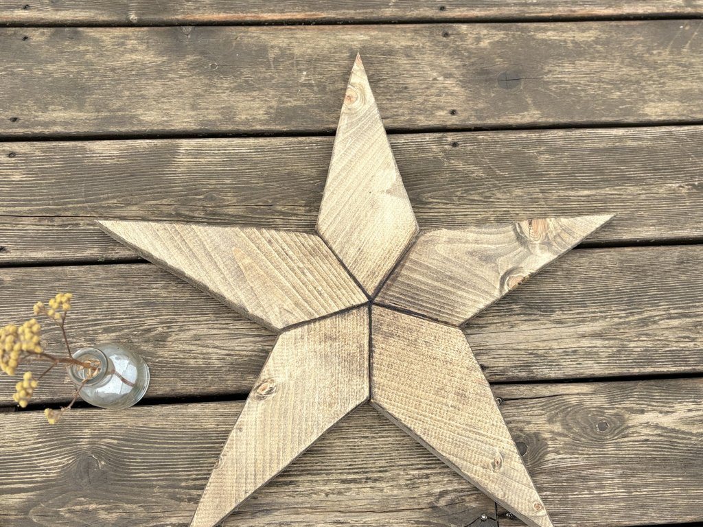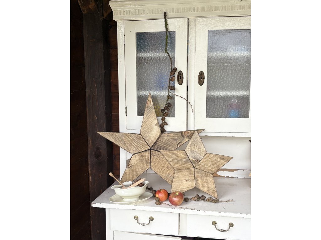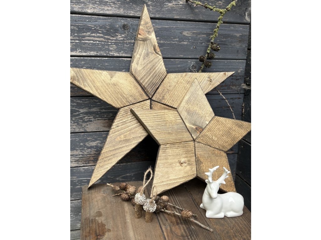 Drevená hviezda v odtieni orech s hrúbkou 2,5 cm. Hviezda nestojí sama, na poličke ju treba oprieť. Ak by ste chceli očko na zavesenie, dajte vedieť.