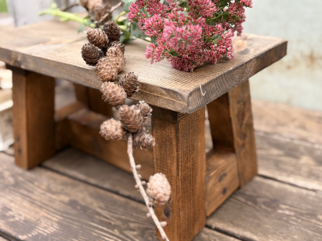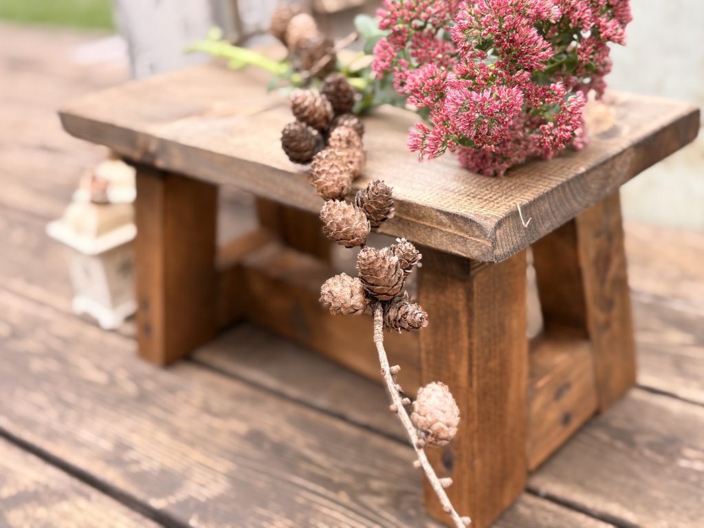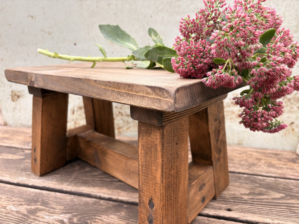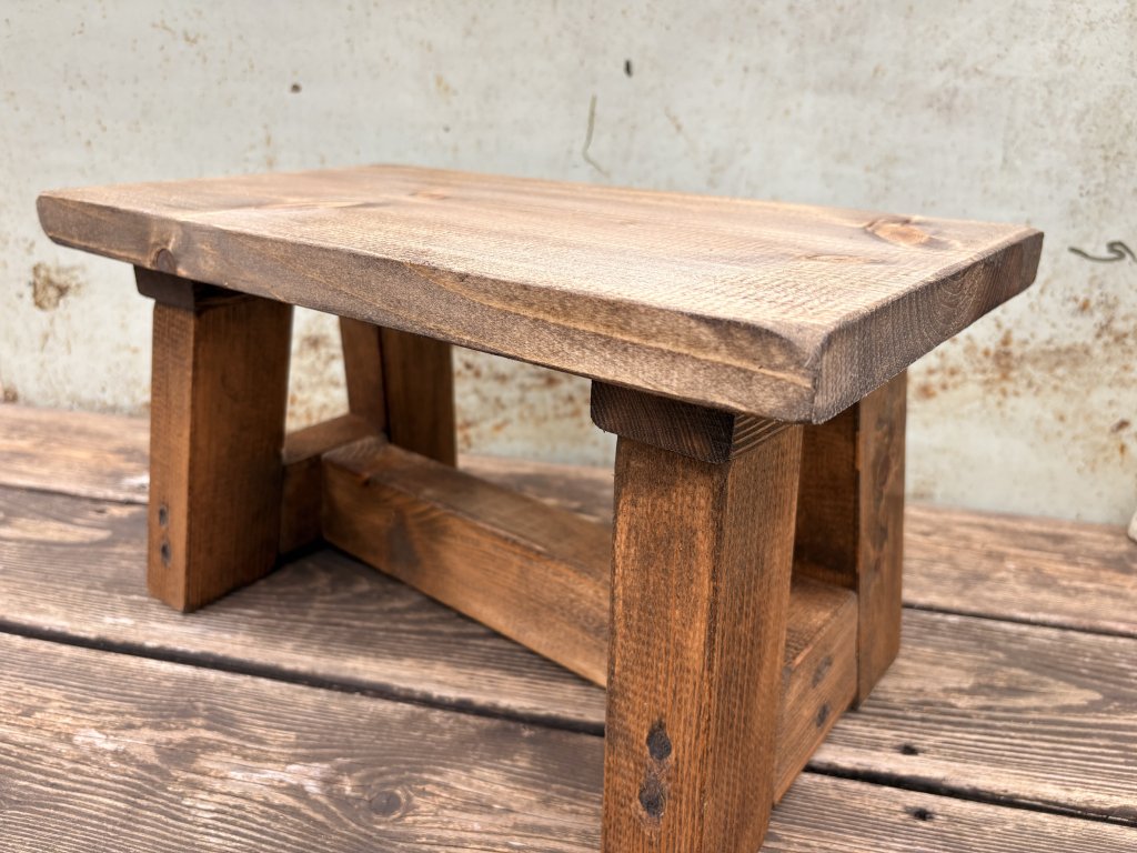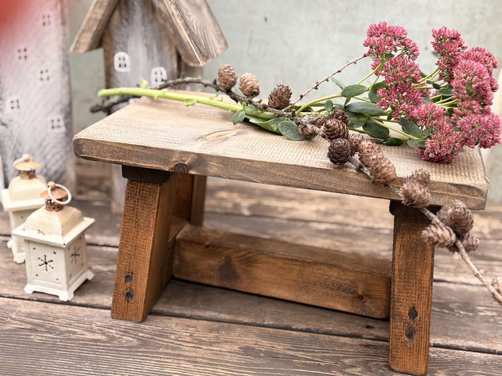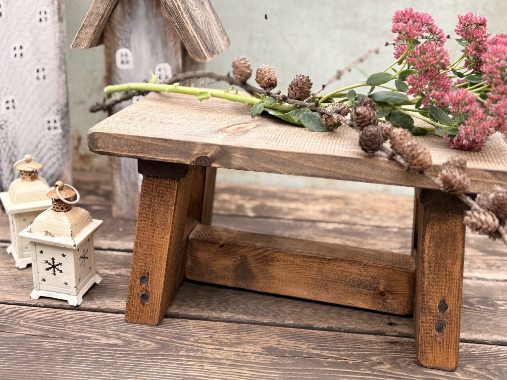Drevený šamlík v odtieni orech s rozmermi 50x23x30 cm (šxvxh). Rozmery sedáku 2,5x22,5x40 cm (hrúbka xšxd).