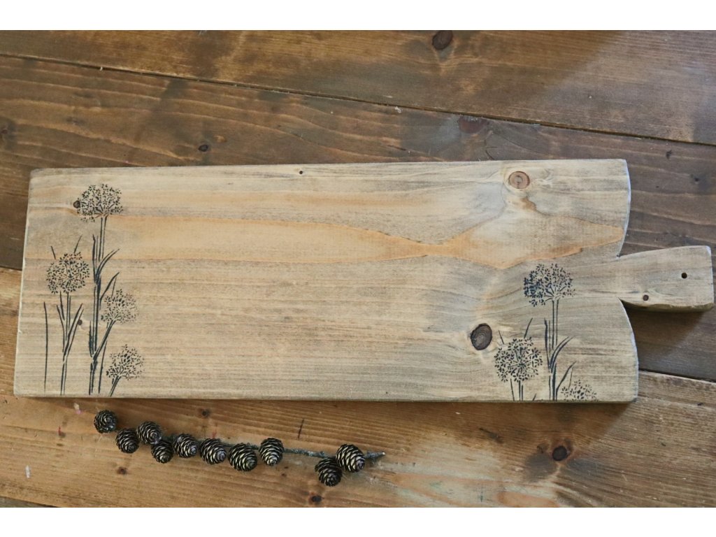 Drevený lopár v odtieni orech s jemnými čiernymi kvietkami alebo v lišajníkovej zelenej s hnedými kvietkami. Lopár v lišajníkovej zelenej je maľovaný z oboch strán a každá má iné kvietky. Rozmery je 22,5x65 cm, hrúbka 2,5 cm. Materiál smrek.