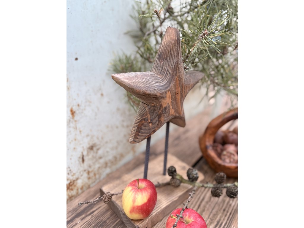 Drevená hviezda na čiernych kovových tyčkách a podstavci. Odtieň orech. Hviezda má 20 cm od cípu k cípu. Výška 35 cm.