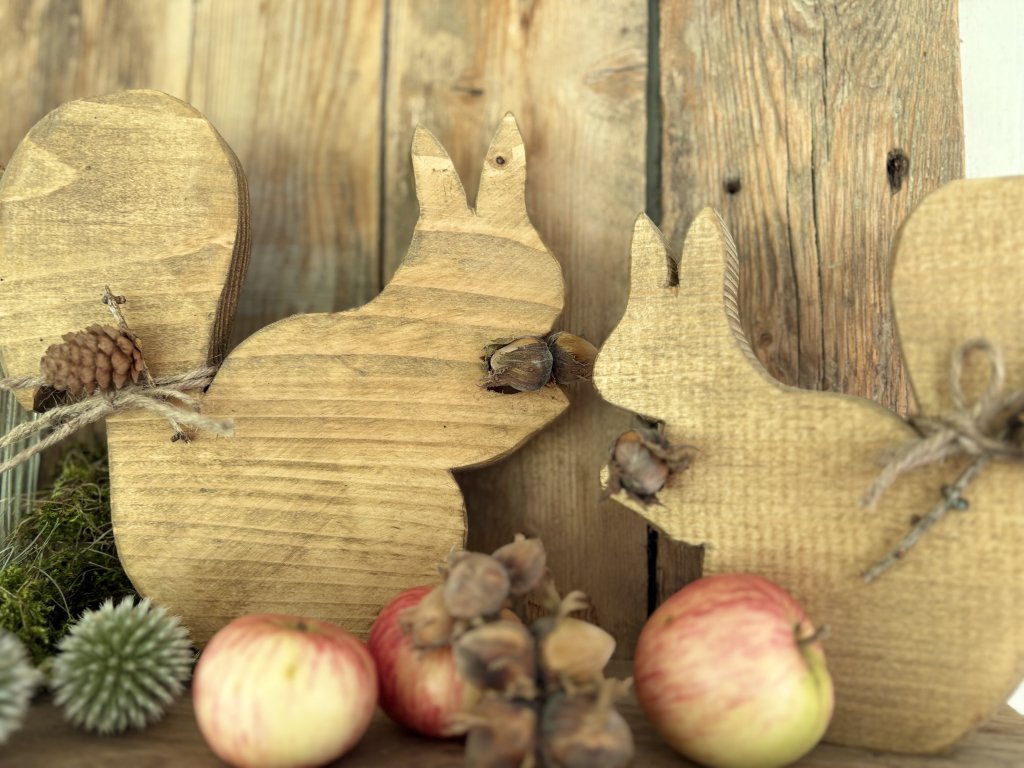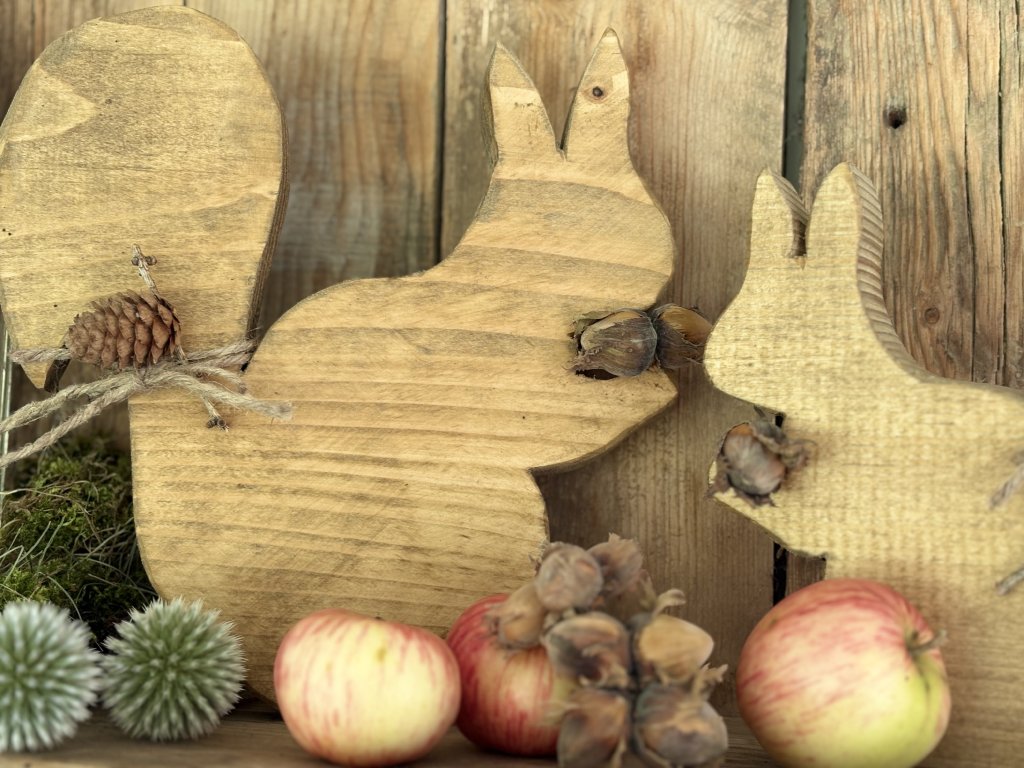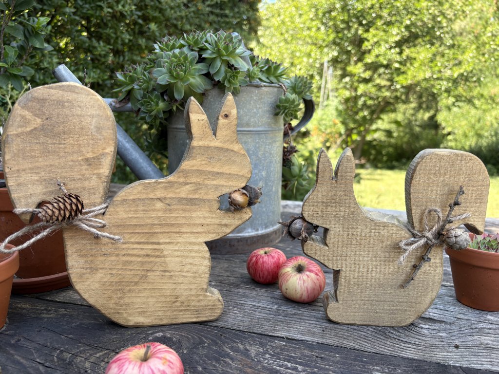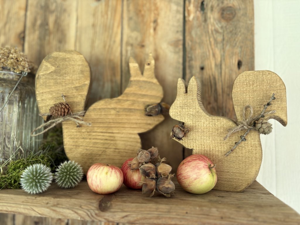 Sada dvoch drevených veveričiek s hrúbkou 2,5 cm. Menšia veverička má 16x17 cm (šxv) a väčšia má 21x22 cm (šxv). Odtieň orech.
