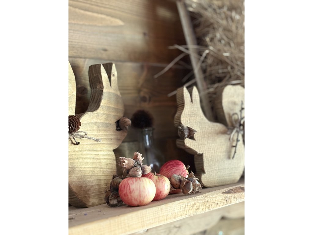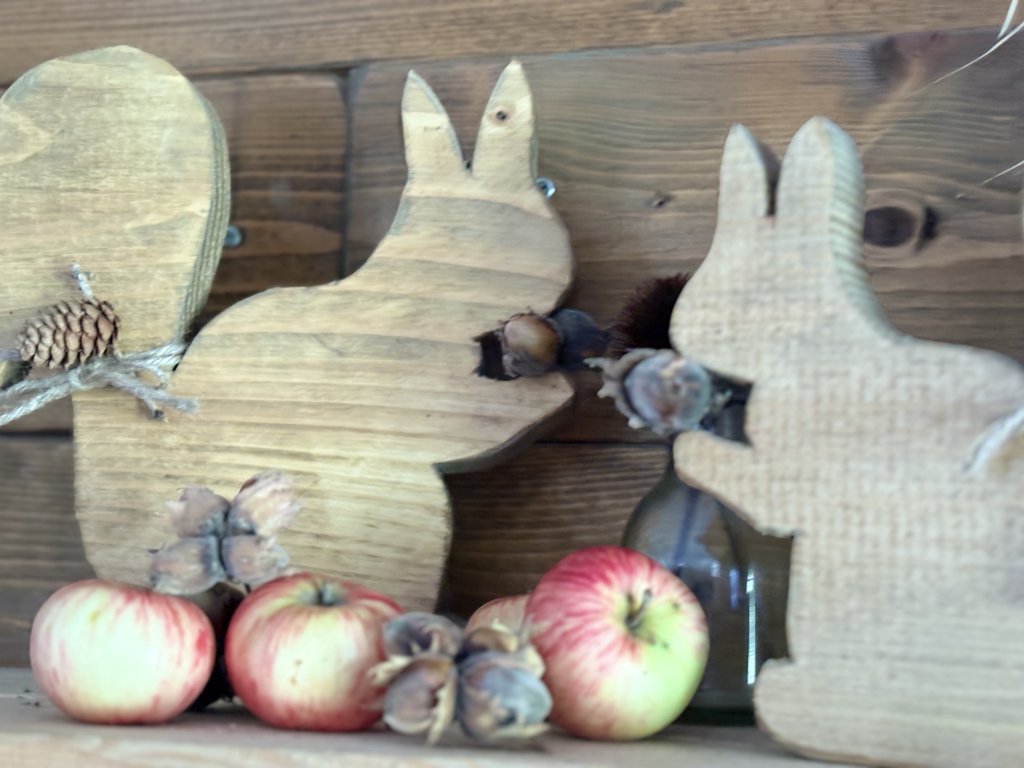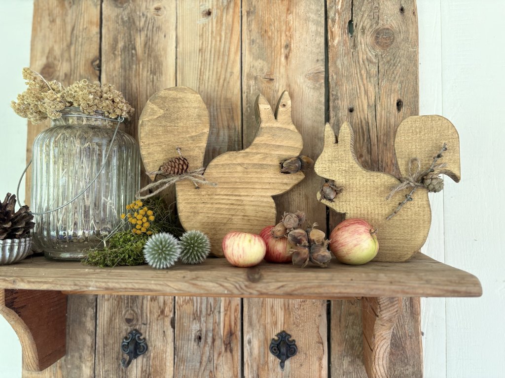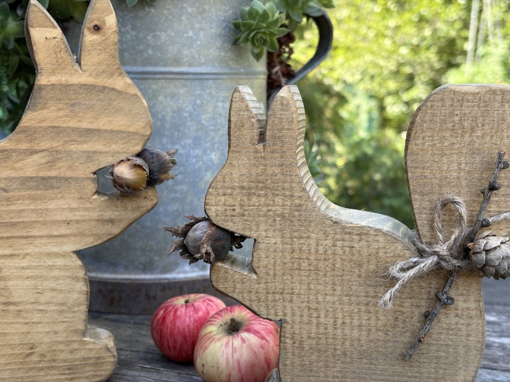 Sada dvoch drevených veveričiek s hrúbkou 2,5 cm. Menšia veverička má 16x17 cm (šxv) a väčšia má 21x22 cm (šxv). Odtieň orech.